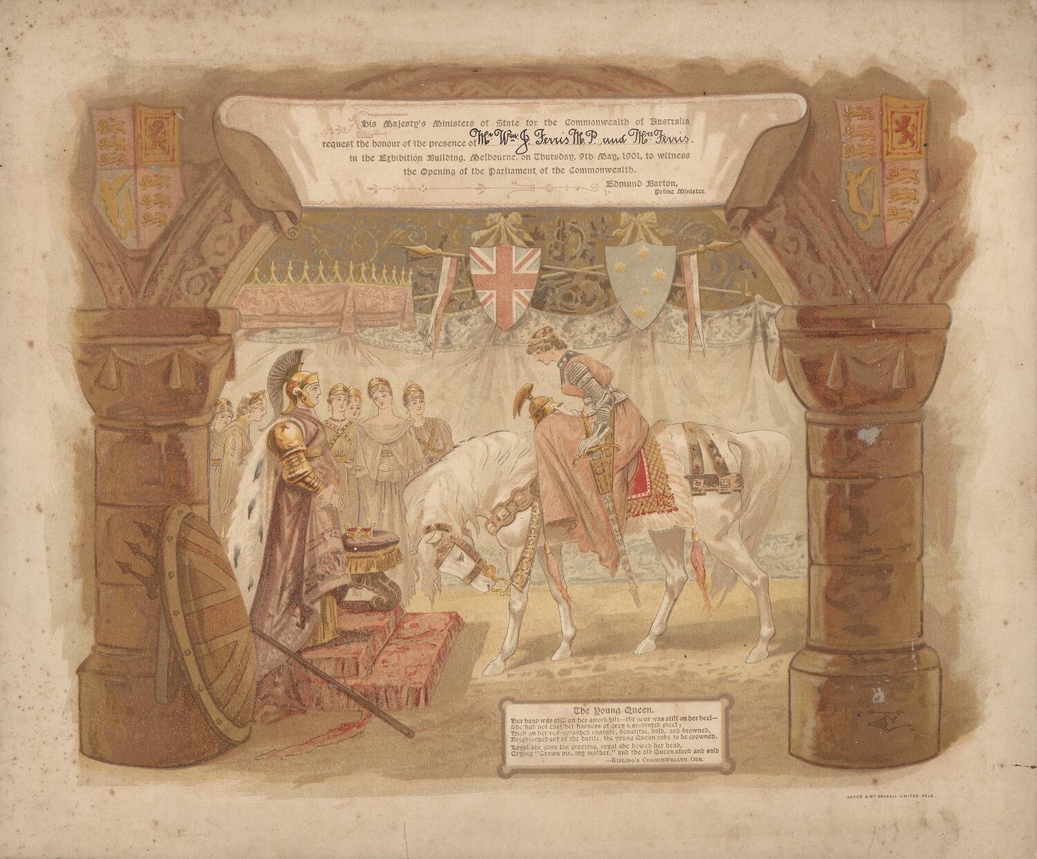 Printed in black ink: 'His Majesty's Ministers of State for the Commonwealth of Australia / request the honour of the presence of [handwritten] Mr. Wm J. Ferris M.P. and Mrs Ferris / in the Exhibition Building, Melbourne, on Thursday, 9th May 1901, to witness / the Opening of the Parliament of the Commonwealth. / Edmund Barton / Prime Minister.'