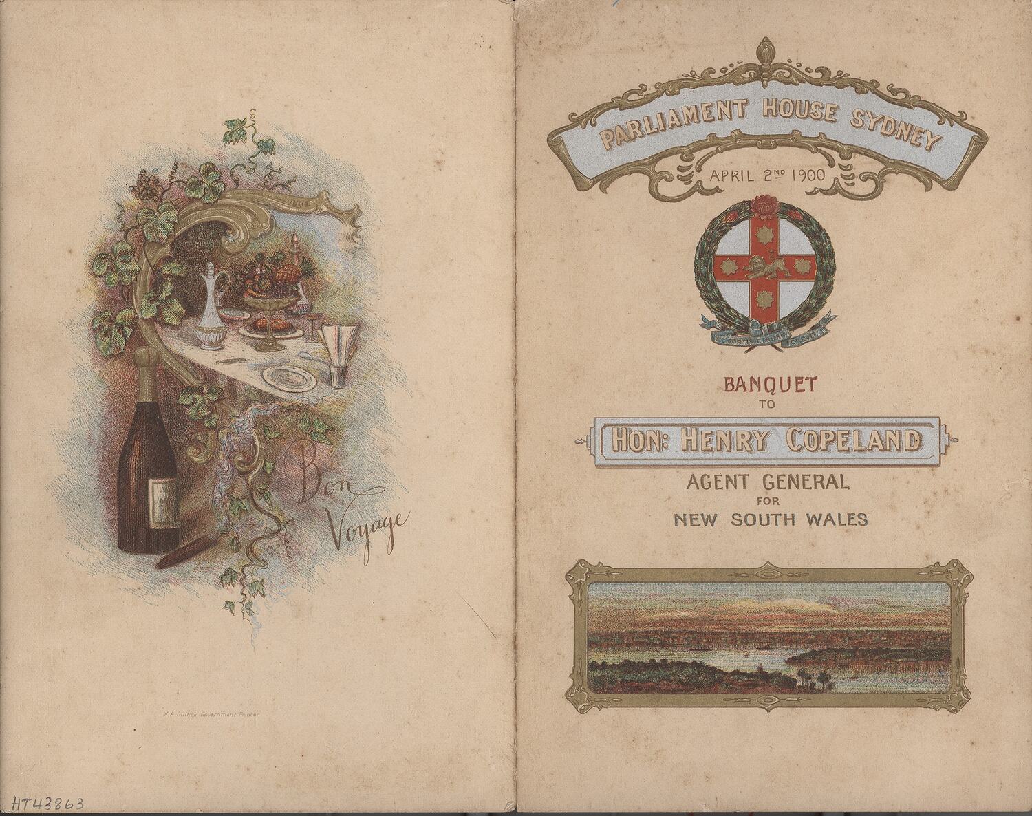 Menu for a Banquet to Honour Henry Copeland, Agent General for New South Wales, which took place at Parliament House, Sydney on 2nd April 1900. It was used by Mr William John Ferris, a member of NSW Parliament at the time.