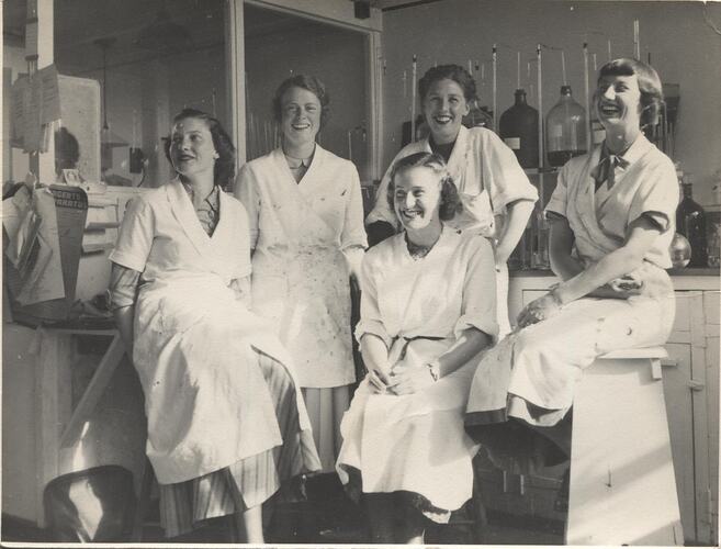 The five women pictured, left to right, are: Joy Shattock, Shirley Wetherall, Miriam Minty (at back), Sharley Meredith (Manager, at front) and June Craig. Staff in this laboratory were responsible for testing chemicals only, not products, but they tested solutions for different departments across the organisation as part of a quality control regimen.