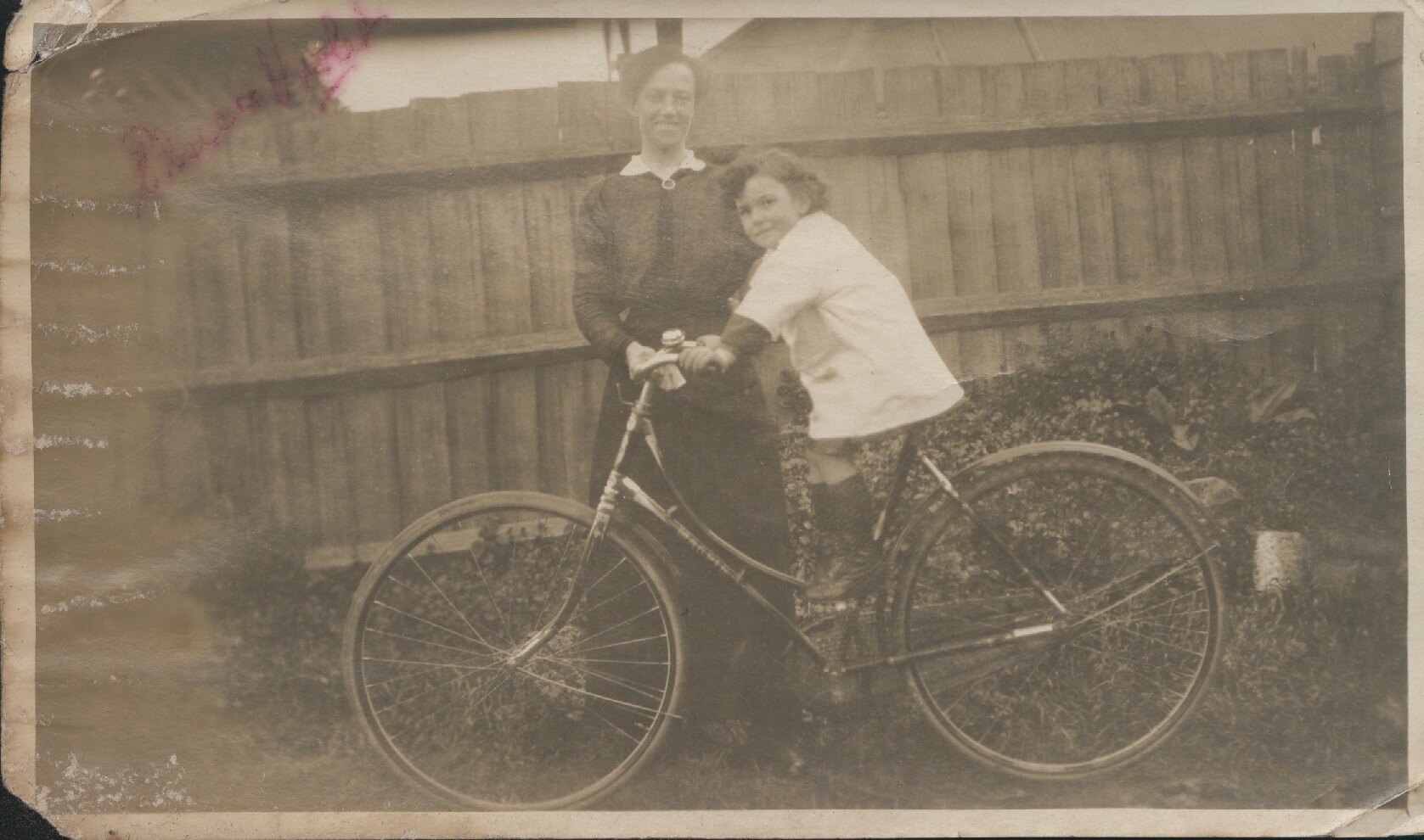 Woman in dark dress in backyard, against a timber fence, with a young girl in boots and white frock on an adult's bicycle.
