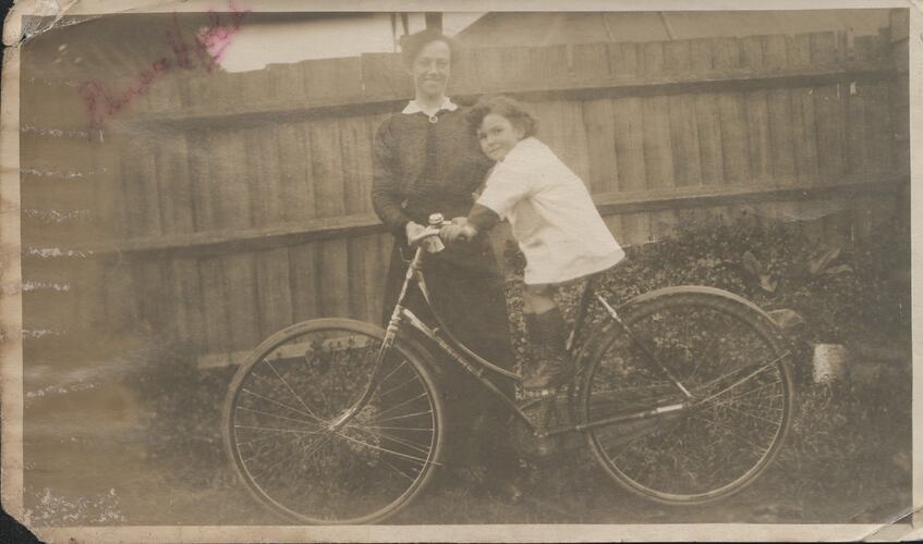Sepia toned photograph of 'Auntie Elsie and Violet', probably taken in Melbourne where Violet grew up. Elsie is standing at left and Violet is on the bicycle.