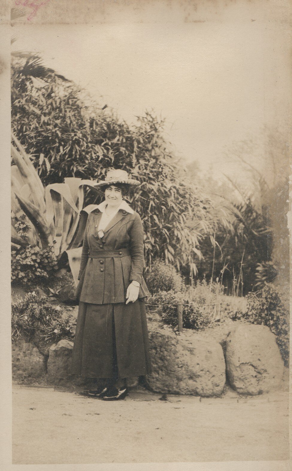 Woman in skirt suit and hat standing in front of a rockery.