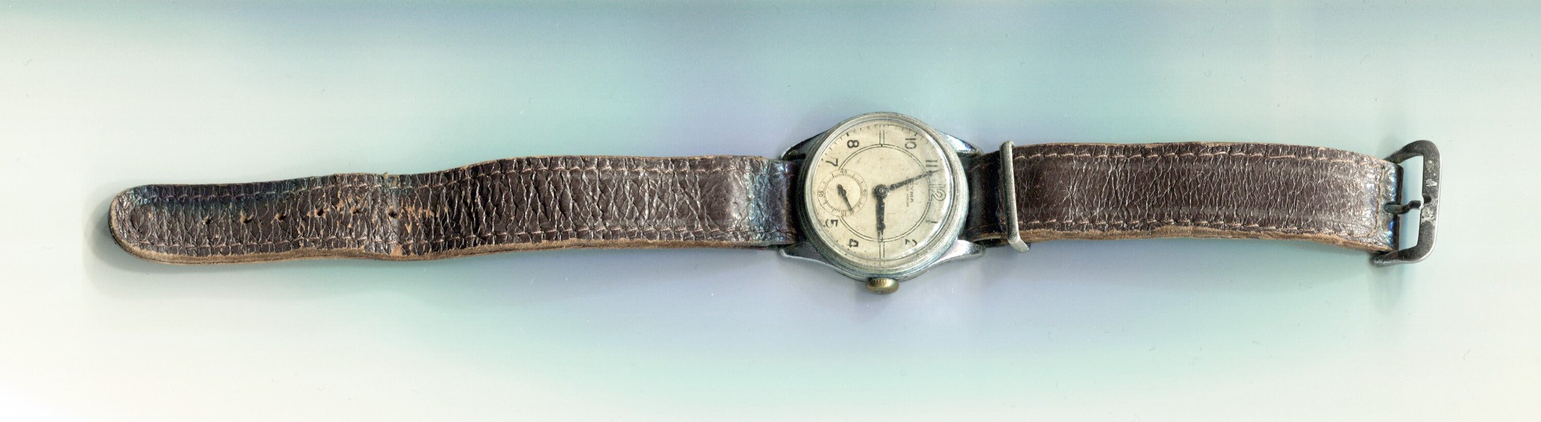 Wrist watch with circular face and worn leather band with metal buckle. Verdigree on back of strap near watch face.