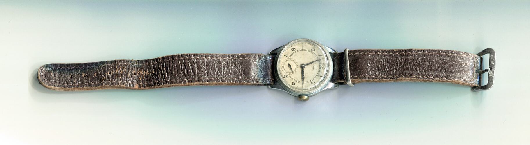 Watch on leather band presented to MacRobertson Pty Ltd employee John Henry Baker on 3 November 1941. Baker, aged 21, was leaving to serve in the Royal Australian Air Force during World War II. He was also given copies of 'A Young Man and a Nail Can' and 'MacRobertson Abroad', both written by company founder Macpherson Robertson and bearing his signature. Baker worked in the Accounts Branch of MacRobertson's from 1937 to 1941 as an office clerk. After serving as a pilot in World War II he completed a Bachelor of Arts at the University of Melbourne under the Commonwealth Reconstruction Training Scheme (CRTS), married and became a French teacher in Victorian high schools.