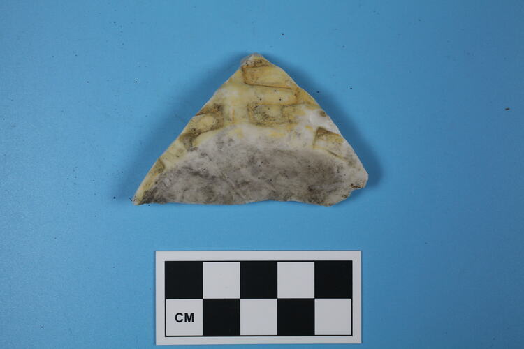 One body/base fragment of a porcelain vessel - possibly a vase, pot, flower pot or other hollowware. External surface with moulded basket-weave decoration, hand painted yellow. Wide curved body, flat base.