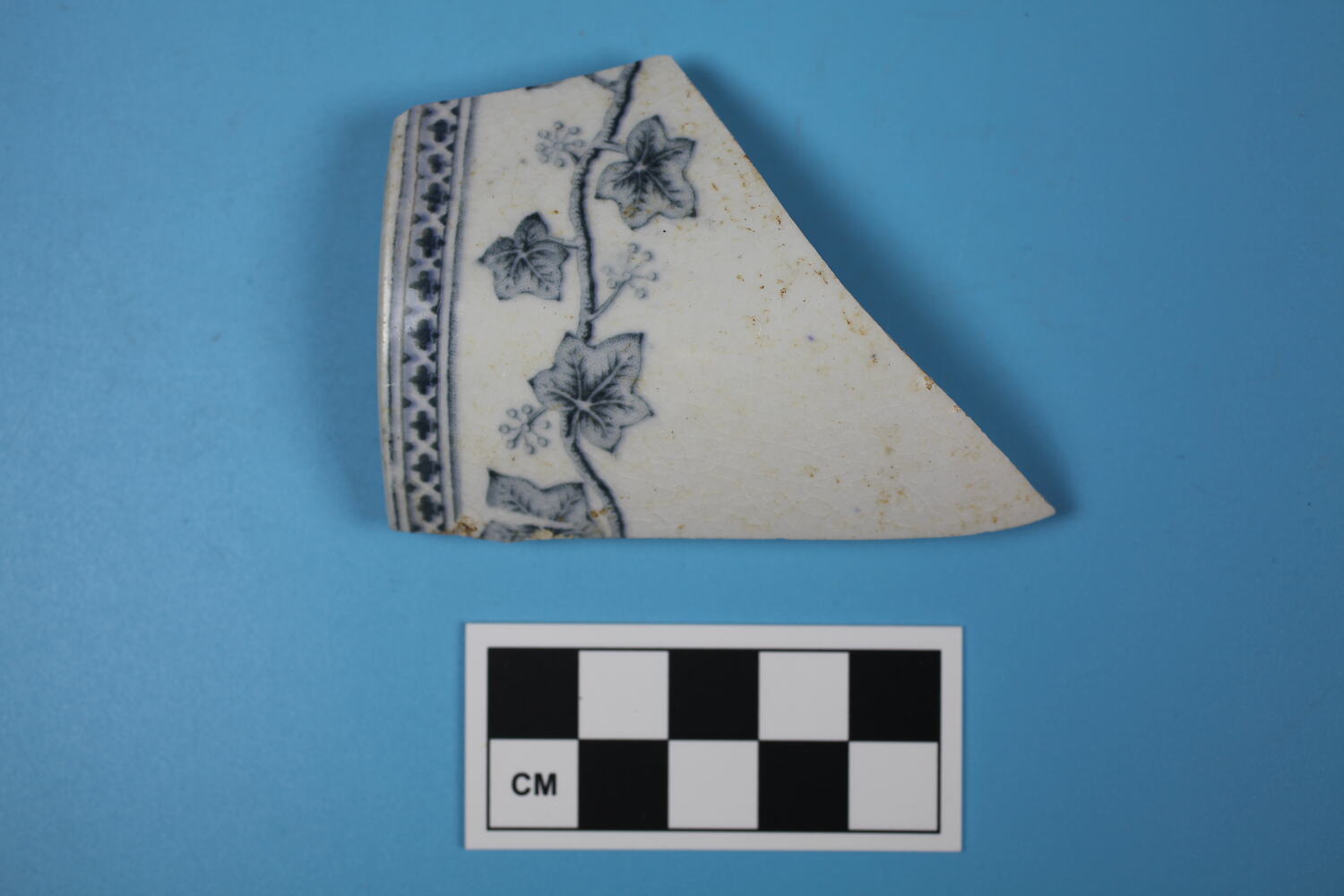 One fragment of whiteware teacup rim and body. Blue-grey transfer printed design on exterior of ivy leaves and vine, with a border of floriated motifs around the rim. Border is repeated around internal rim.