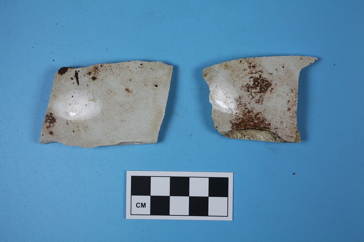 Two whiteware body fragments. Curved. Domestic vessel, possibly a bowl or chamber pot. Undecorated.