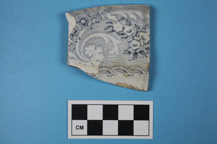 One whiteware plate rim fragment. Blue-Grey transfer printed Rhine border on curved marly.