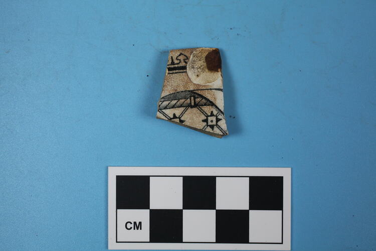 One whiteware plate rim fragment. Black transfer print design, geometric shapes including spades, infilled triangles, squares, and rope-like motifs.