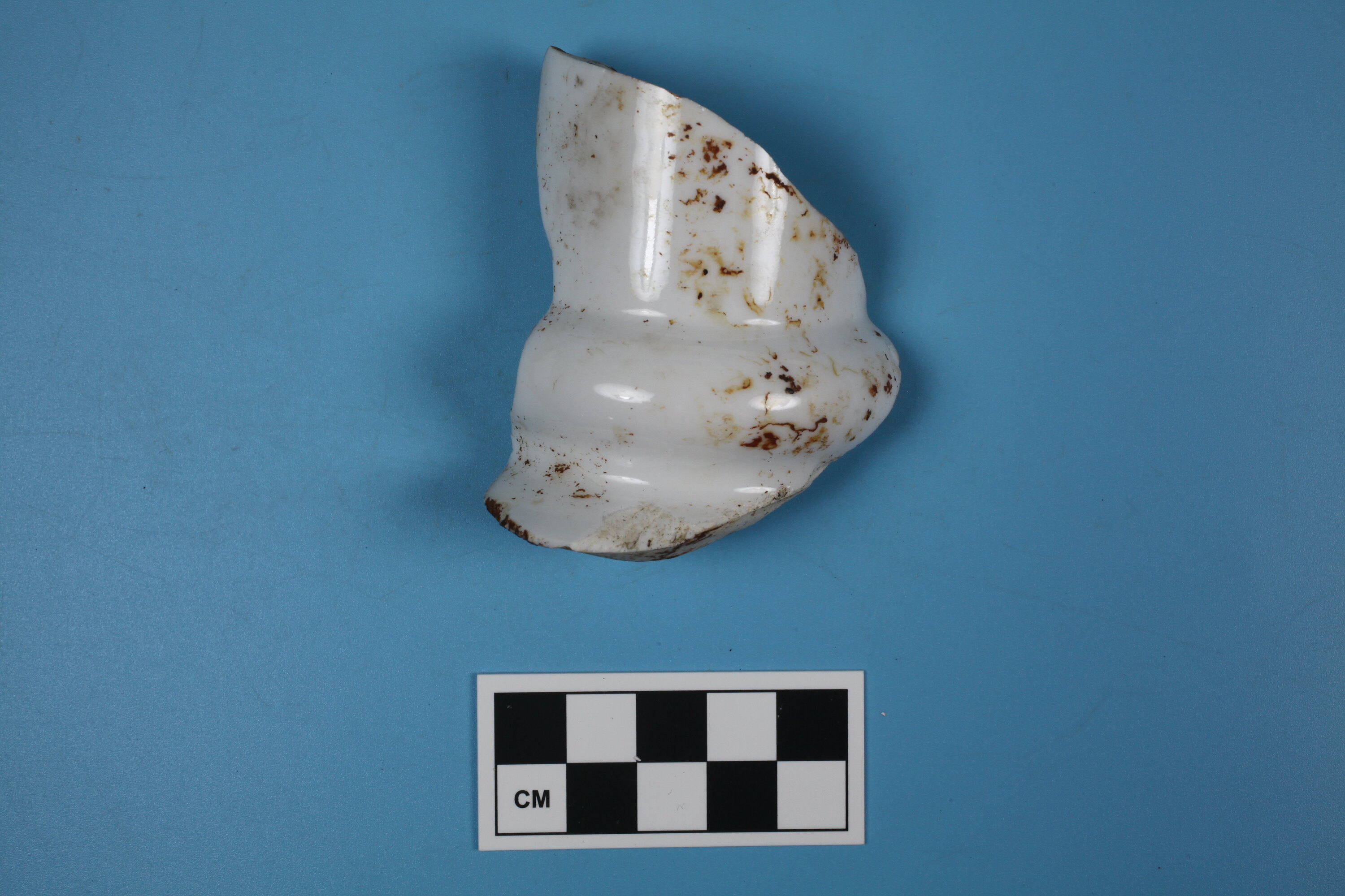Fragment of white porcelain telegraph or electrical pole insulator. Internal thread and external wire ridge and groove present.