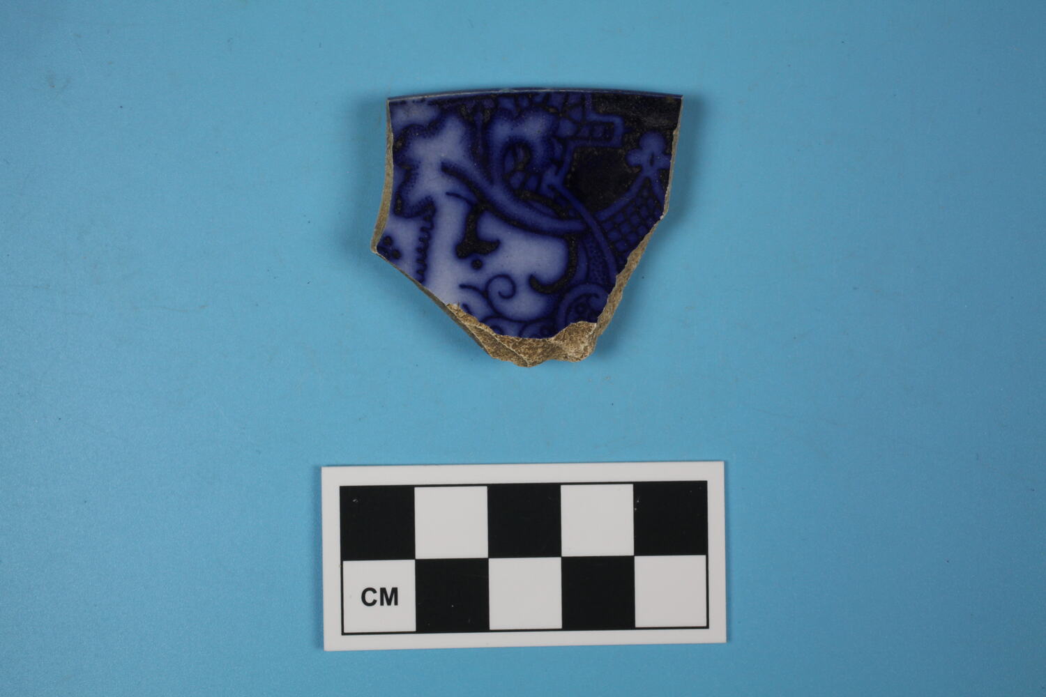 One fragment of whiteware rim. Plate or saucer. Blue Transfer printed flow design, geometric Chinese theme border.