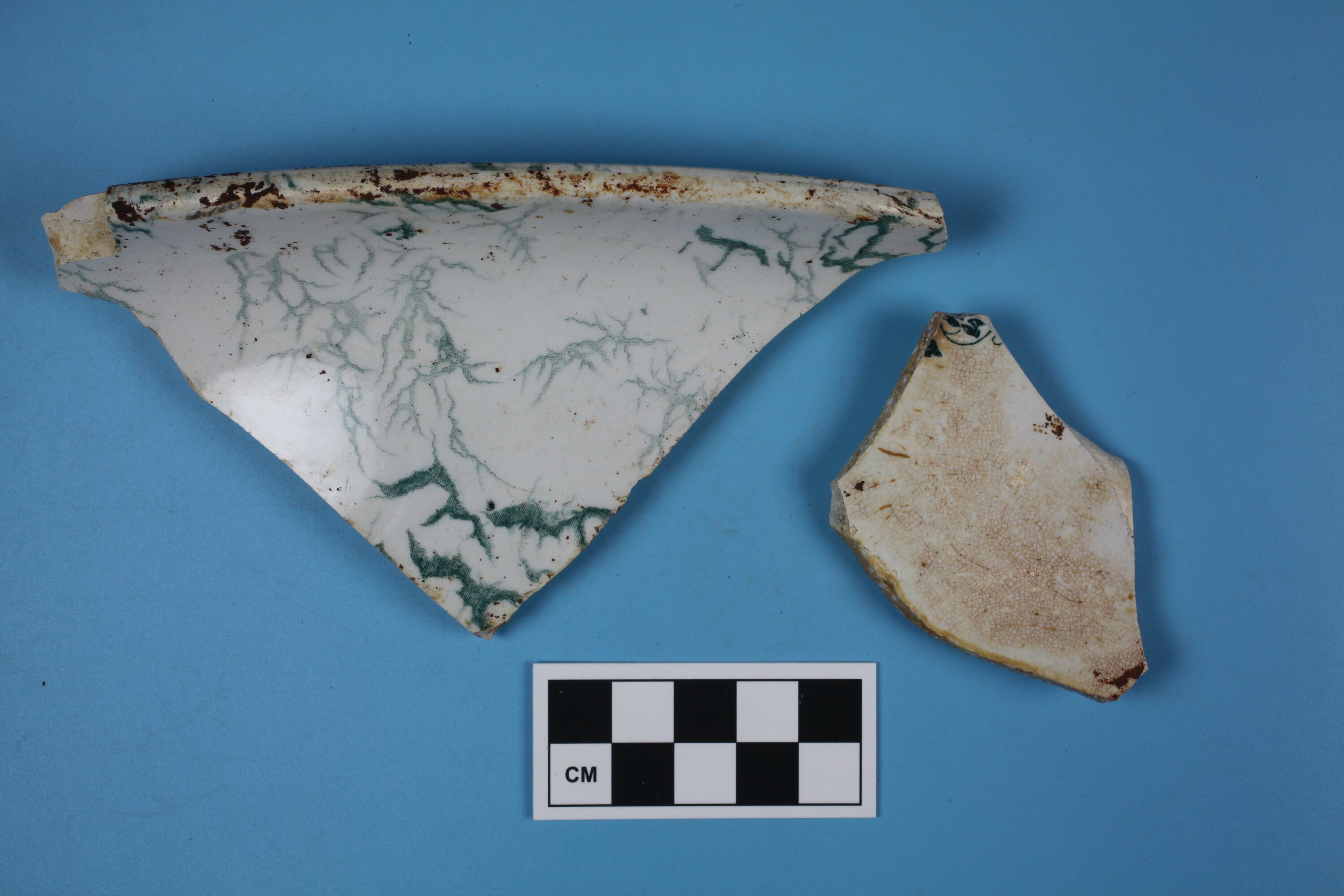 Two whiteware fragments. One wash basin rim fragment with green transfer printed marble design on both sides. One saucer body/base fragment with small section of green trasfer printed vine design, with cup well and single foot.