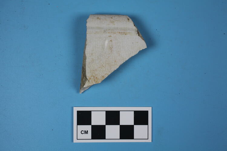 One whit granite rim fragment. Moulded design around rim. Probably a serving platter.