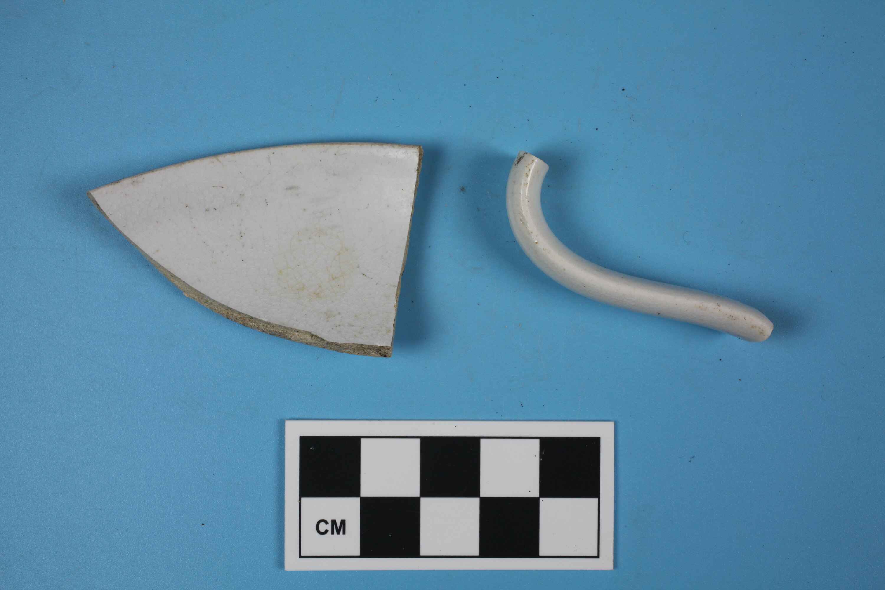 Two undecorated whiteware tea vessel fragments. One handle. One saucer rim.