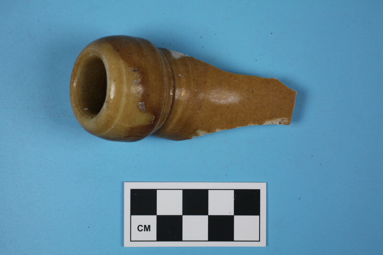 One fragment of stoneware bottle. Finish and neck fragment, two part v-shaped finish, tapered neck. Bristol Glaze - cream ware, tan glaze.