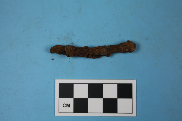 One complete or near-complete iron alloy nail. Probably wrought with rose head.