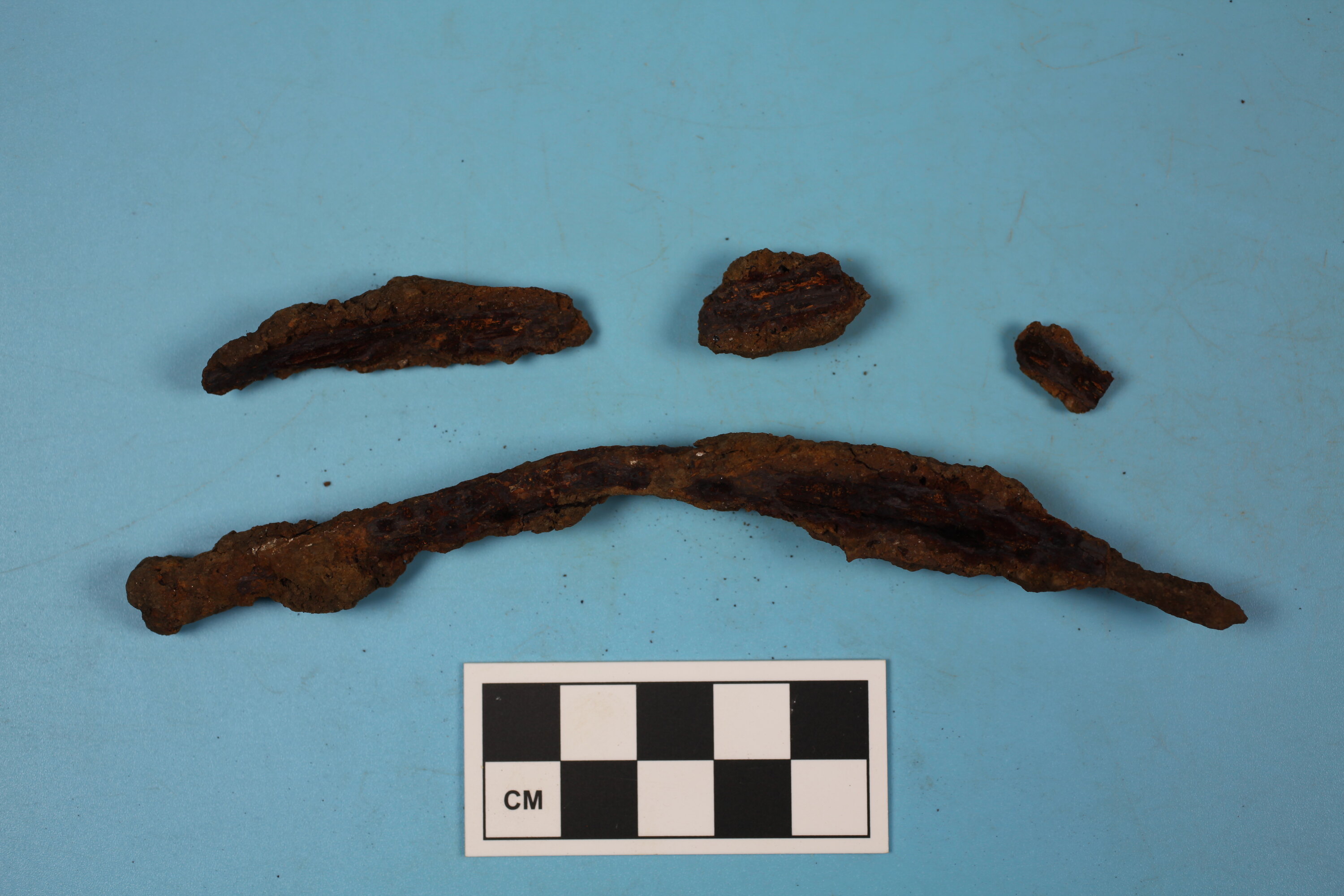 Four fragments of one iron alloy nail. Probably wrought.
