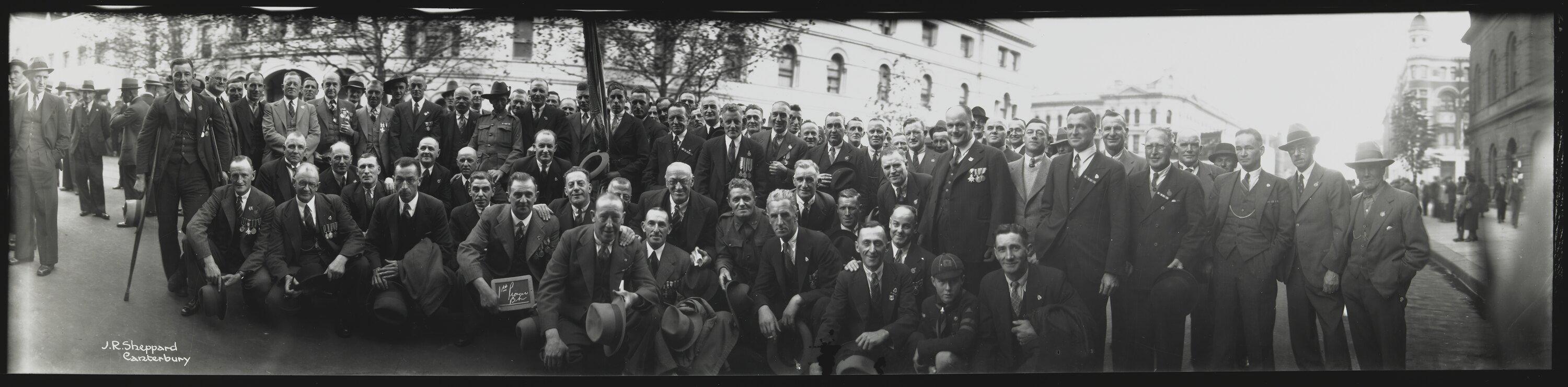 Panoramic contact print of Anzac Day marchers, Melbourne, 1st Pioneer Battalion, post World War I.