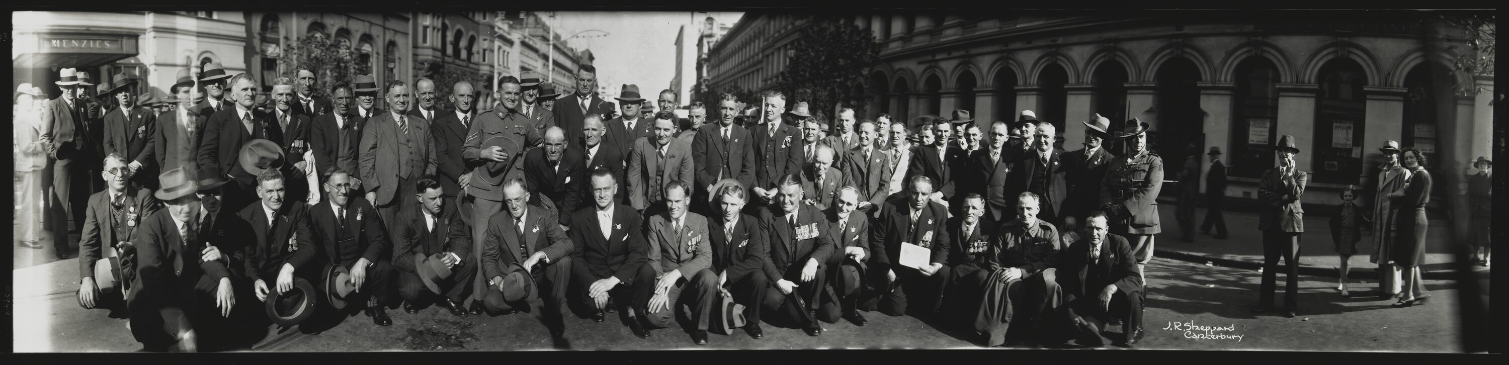 Panoramic negative of Anzac Day marchers in Melbourne. Men dressed in suits and uniform.