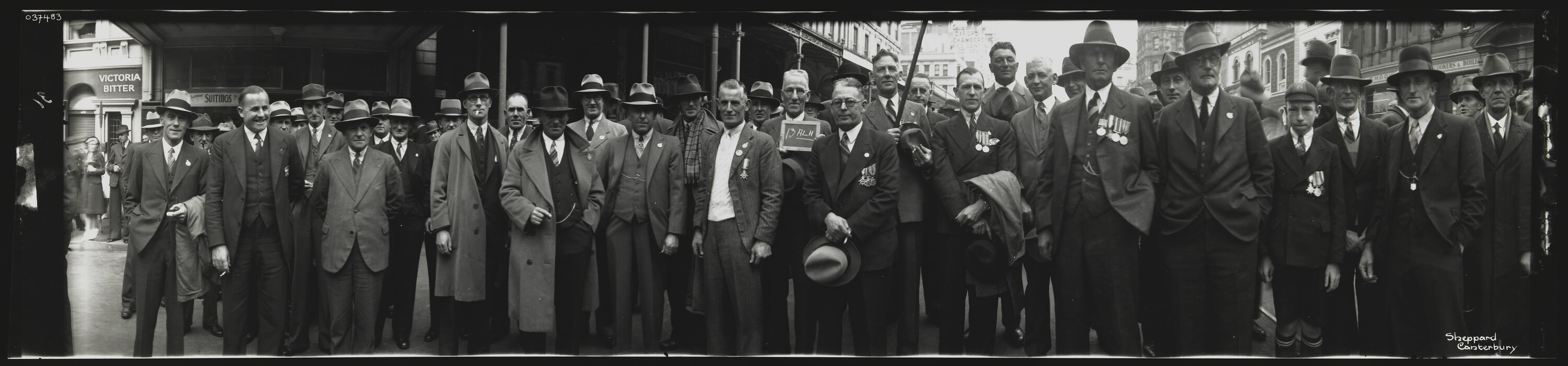 Panoramic group portrait of Anzac Day marchers in Melbourne. Men dressed in suits some with ribbons and medals on their chests.