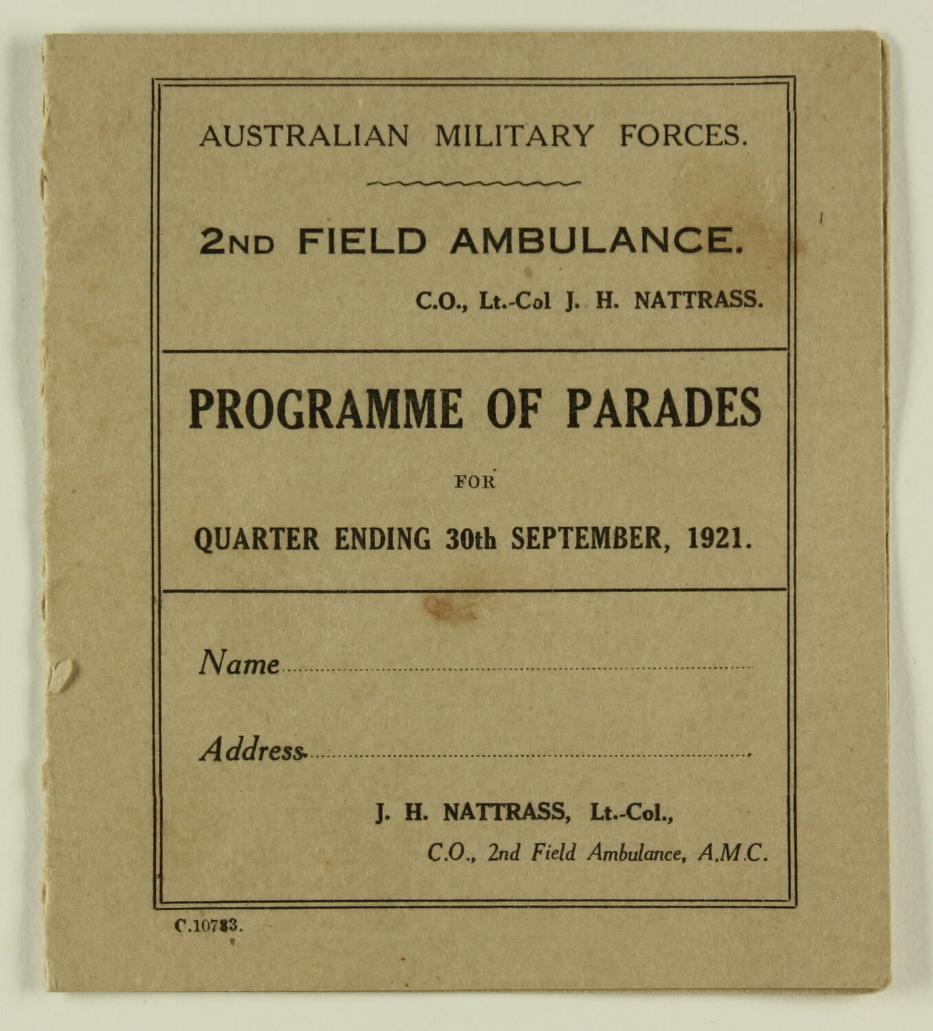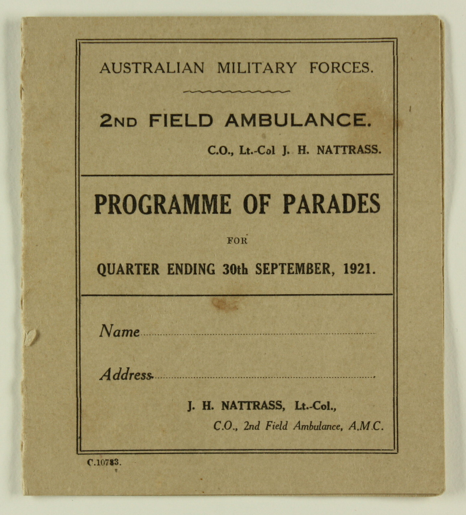 Text: AUSTRALIAN MILITARY FORCES/2ND FIELD AMBULANCE/C.O. Lt-Col J.H. NATTRASS/PROGRAMME OF PARADES/FOR/QUARTER ENDING 30th SEPTEMBER, 1921.