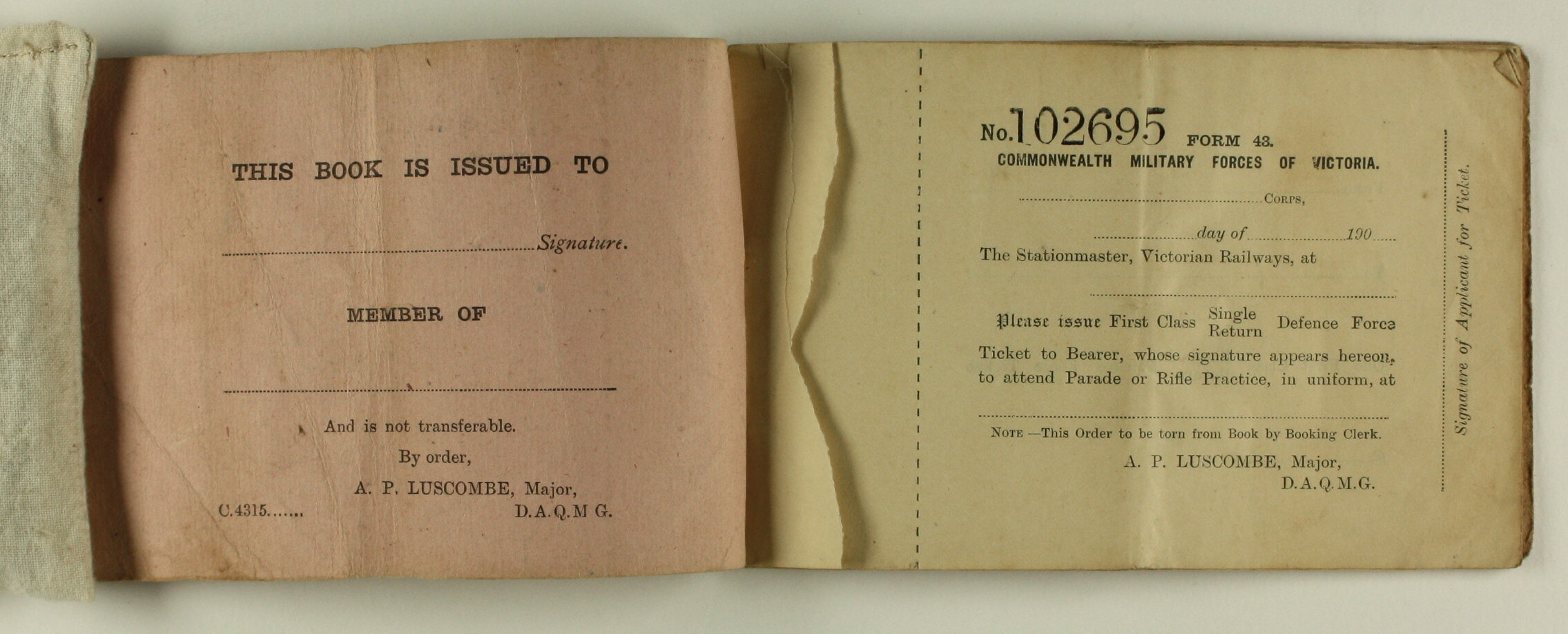Printed inside cover: 'THIS BOOK IS ISSUED TO / ...... Signature. / MEMBER OF / ........ / And is not transferable. / By order, / A. P. LUSCOMBE, Major, / C, 4315....... / D.A.Q.M.G.' Printed on each ticket: 'No. 102695 [incrementing] FORM 43 / COMMONWEALTH MILITARY FORCES OF VICTORIA. / ...... CORPS, / .......day of ...... 909..... / The Stationmaster, Victorian Railways, at / ..... / Please issue First Class Single/Return Defence Force / Ticket to Bearer, whose signature appears hereon, / to attend Parade or Rifle Practice, in uniform, at / ..... / NOTE - This order to be torn from Book by Booking Clerk. / A. P. LUSCOMBE, Major, / D.A.Q.M.G. / ......... / Signature of Applicant for Ticket.'
