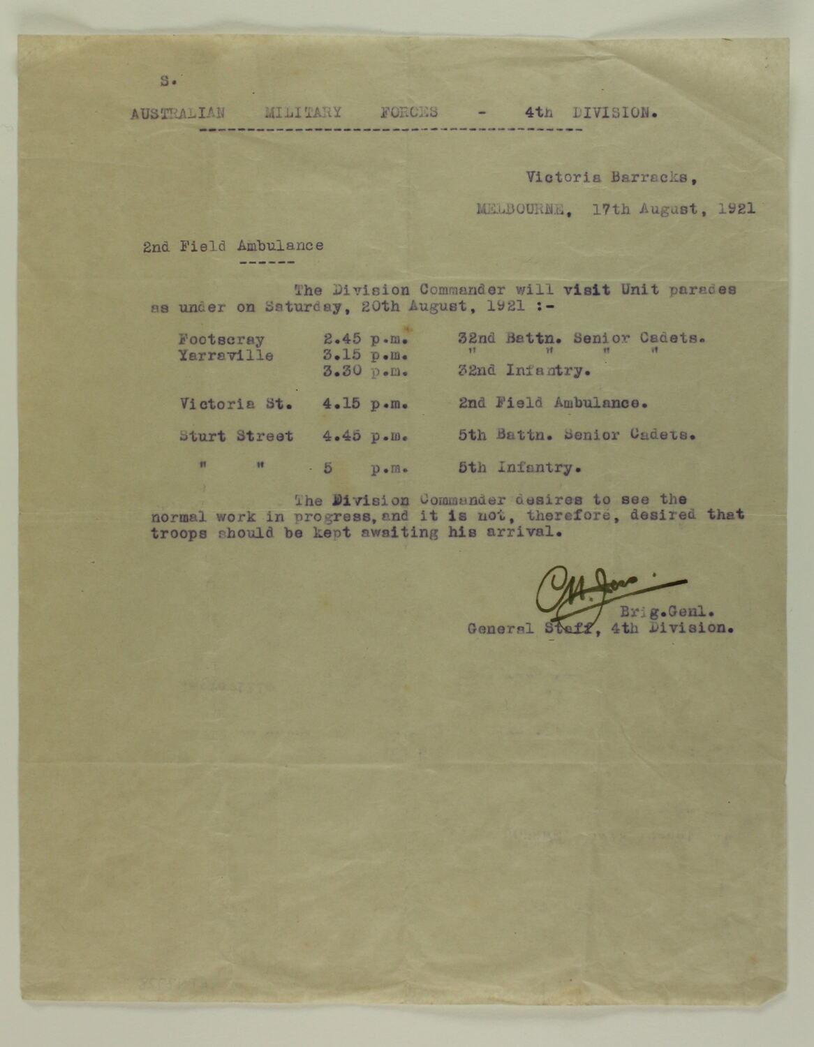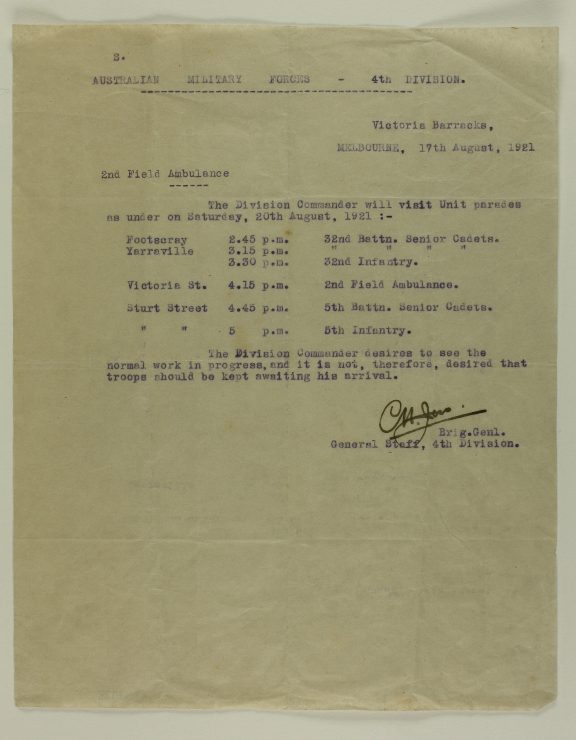 Program typed in purple, dated 17 August 1921, outlining plans for a visit by the 4th Division Commander to the 2nd Field Ambulance on Saturday 21 August 1921. The Commander was planning to visit unit parades at Footscray, Yarraville, Victoria Street and Sturt Street. Parading before him were the 32nd Battalion Senior Cadets, 32nd Infantry, 2nd Field Ambulance, 5th Battalion Senior Cadets and the 5th Infantry.