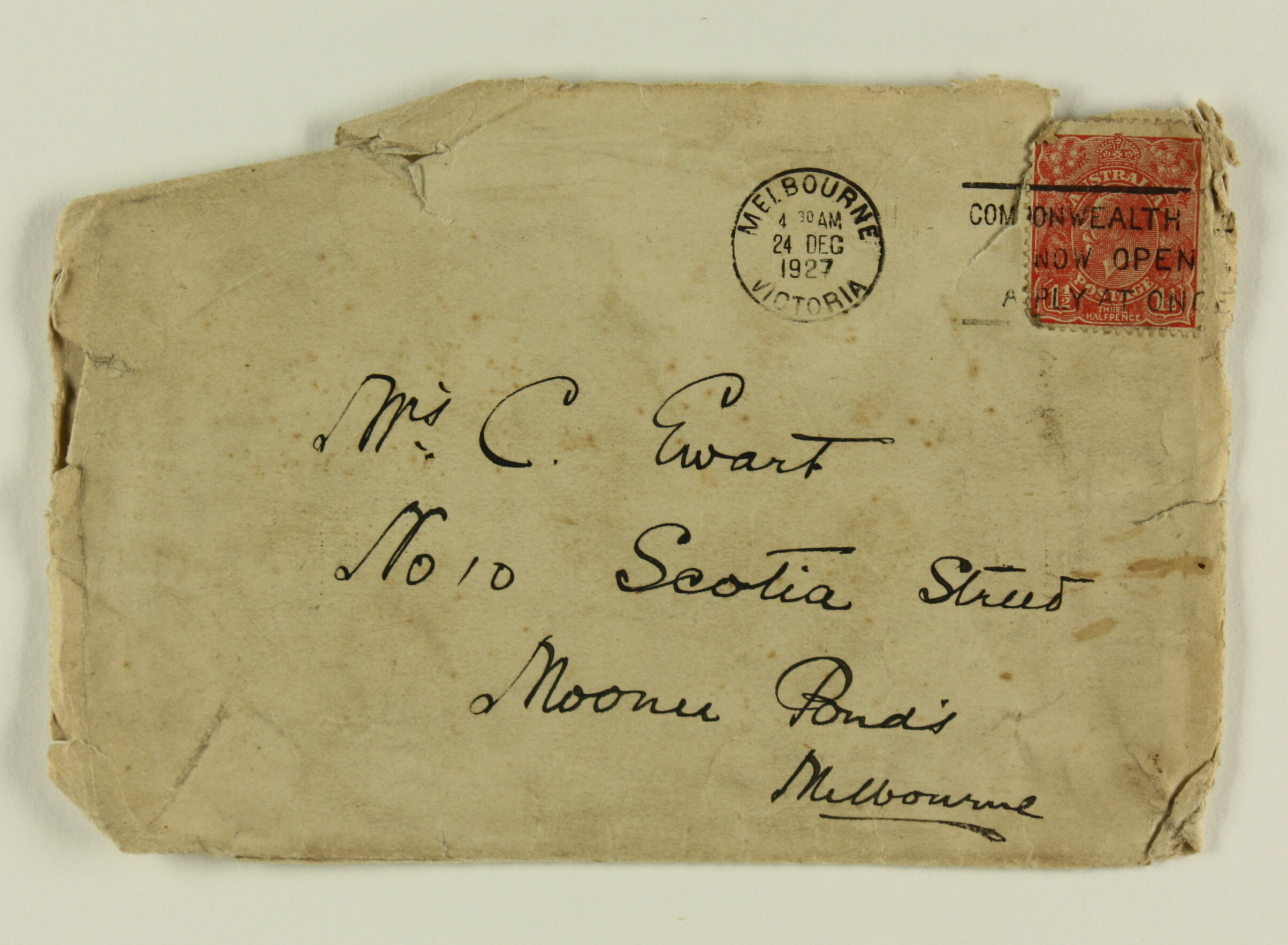 Hand-written in ink: 'Mrs C. Ewart / No 10 Scotia Street / Moonee Ponds / Melbourne'. Rubber stamp imprint: 'MELBOURNE / 4.30 AM / 24 DEC / 1927 / VICTORIA'. Rubber stamp imprint over postage stamp: 'COMMONWEALTH / NOW OPEN / APPLY AT ONCE [?]'