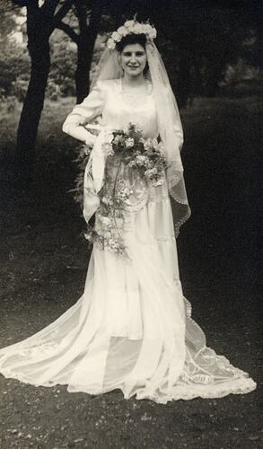 Black and white photograph of Eileen Leech standing in a garden setting in her wedding gown. It is one of six black and white photographs contained in a wedding album of James and Eileen Leech's wedding ceremony in Manchester, England, 1 August 1949. The album was amongst possessions brought with them when they migrated to Australia in 1953 and also amongst those they brought back to England when they returned in 1956.