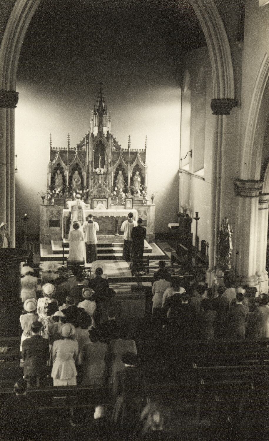 Black and white photograph of Eileen and James Leech's wedding ceremony. It is one of six black and white photographs contained in a wedding album of James and Eileen Leech's wedding ceremony in Manchester, England, 1 August 1949. The album was amongst possessions brought with them when they migrated to Australia in 1953 and also amongst those they brought back to England when they returned in 1956.