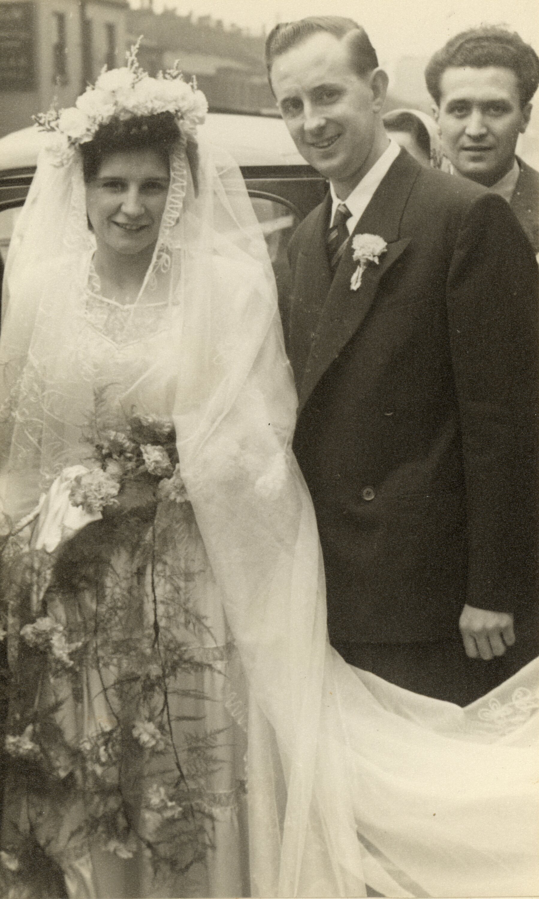 Black and white photograph of Eileen and James Leech in wedding attire standing next to their bridal car. It is one of six black and white photographs contained in a wedding album of James and Eileen Leech's wedding ceremony in Manchester, England, 1 August 1949. The album was amongst possessions brought with them when they migrated to Australia in 1953 and also amongst those they brought back to England when they returned in 1956.