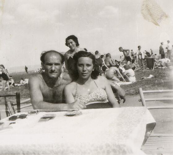 Black and white digital photograph of Zoltan and Margit Schmideg at public baths in Gyor, Hungary, 13 July 1947. Gyor was Margit's home town and the couple lived and set up business there after marrying in 1946. The couple migrated to Australia with their sons Stephen and Peter from Hungary in January 1957.