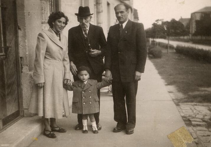 Black and white digital photograph of Zoltan and Margit Schmideg with their son Stephen and Zoltan's father Ignac outside the family home in Gyor, Hungary in May 1949. Gyor was Margit's home town and the couple lived and set up business there after marrying in 1946. The couple migrated to Australia with their sons Stephen and Peter from Hungary in January 1957.