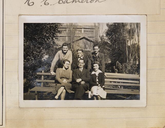 Based on dates of other material on scrapbook page this could date to 1944. However, Noel was at war during the 1940s and didn't return until after the war so photograph this more likely dates to 1945 or 1946, unless he was visiting his workmates during the war. -