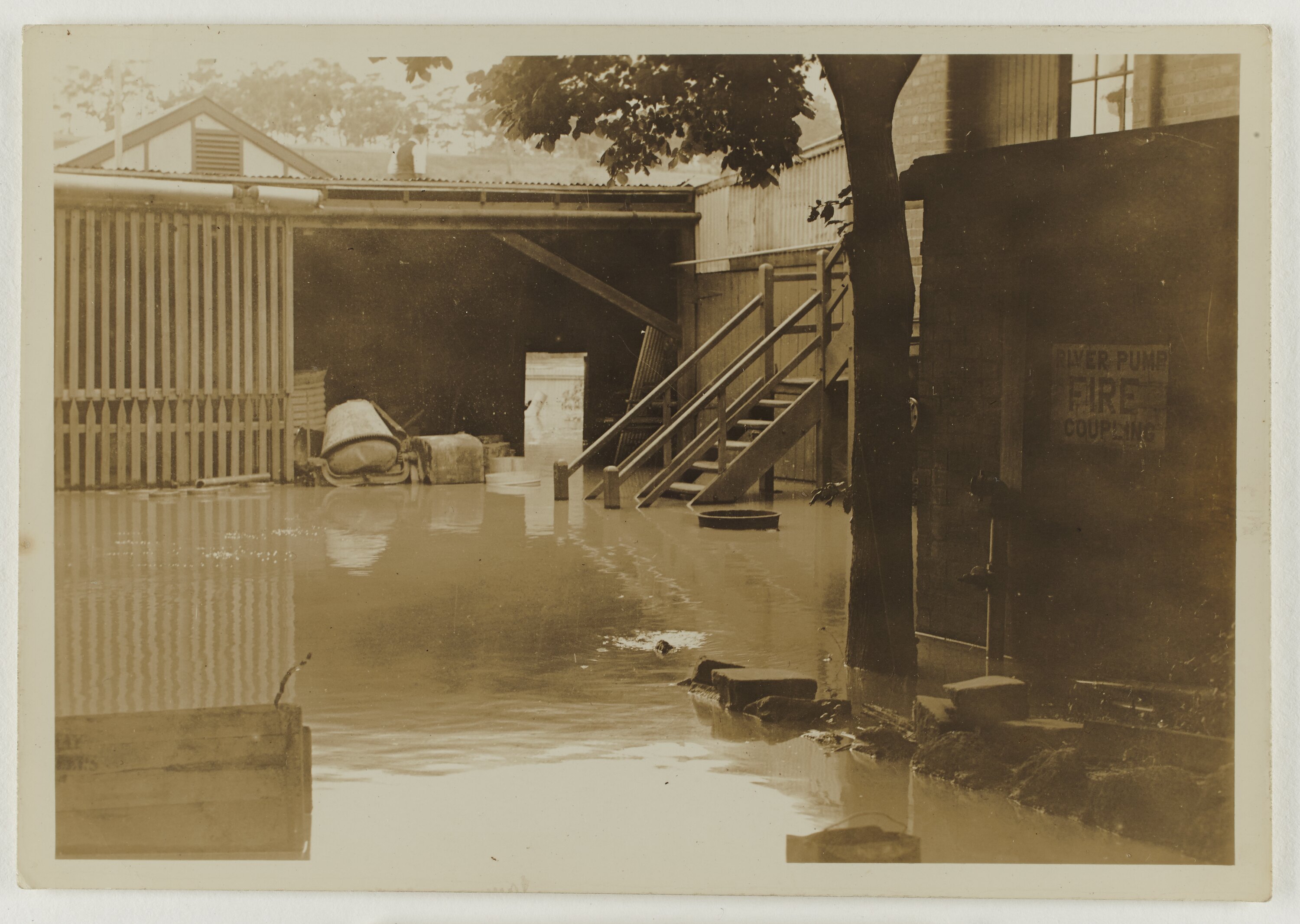 Photograph of workshop buildings in flood in the Kodak Australasia factory in Abbotsford, Victoria, 1934. To the right of the image is a river pump to draw water from the Yarra in case of fire. This photograph was donated by Max Myers. Both he and his father Jim worked as plumbing foreman at the Kodak factory, and this photograph is documenting the flood damage in their work area.