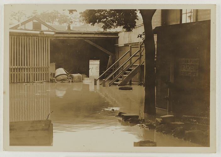 Flooded area outside corrugated iron and timber buildings with equipment half submerged in flood waters. Tree and water pump at right of image with a sign on the wall saying "RIVER PUMP / FIRE COUPLING".