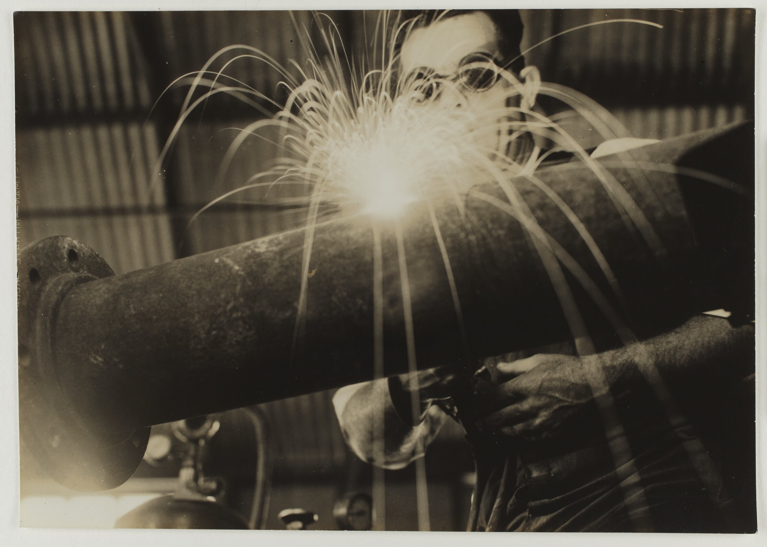 Monochrome photograph of Jim Myers, a former Kodak Australasia employee, oxy acetylene welding a pipe in the Kodak factory workshops in Abbotsford, Victoria, circa 1930s.