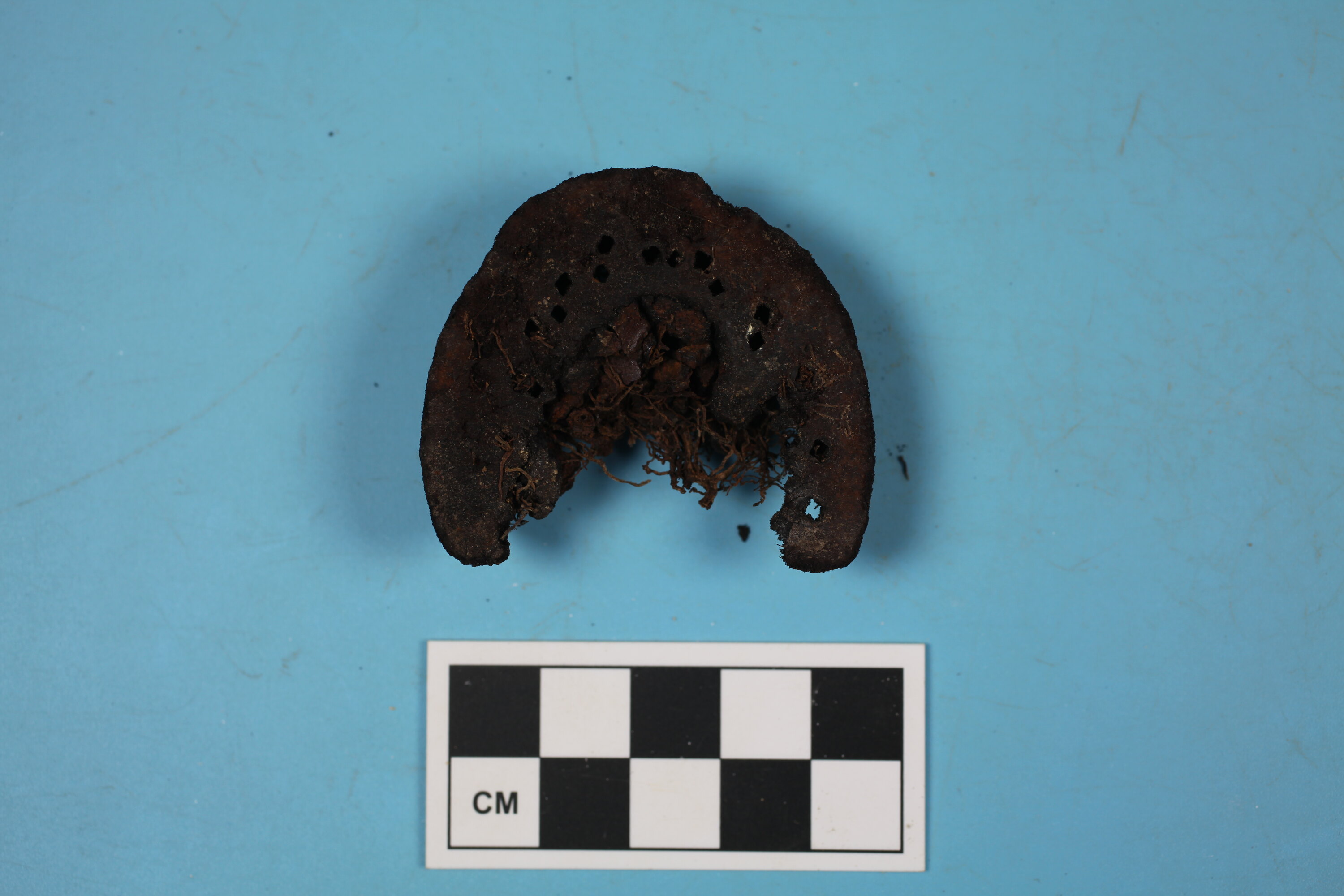 One stacked leather heel fragment. Fibrous material present. Possible iron alloy nails present. One large heel fragment and 14 very small (less than 1cm) fragments of leather and fibre.