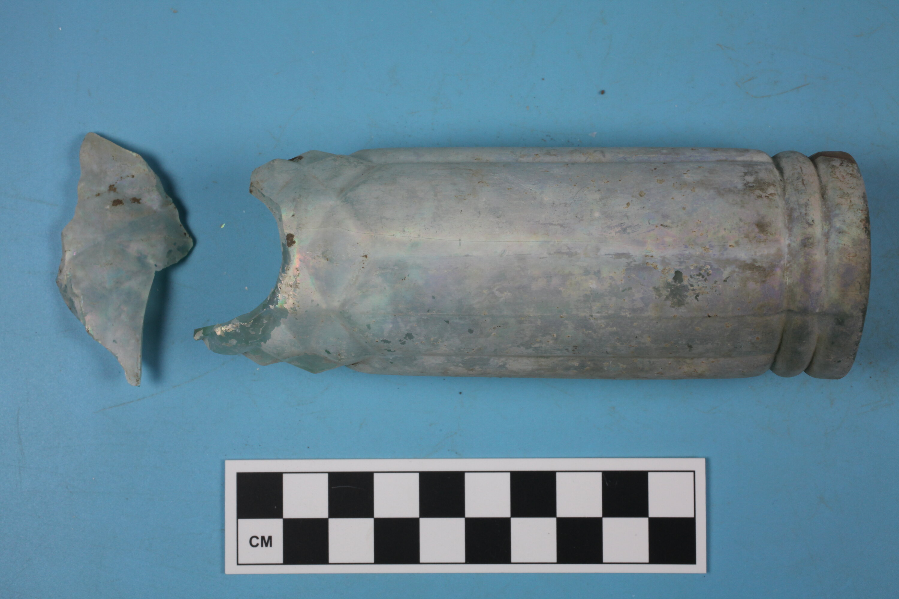 Two conjoining fragments of light green salad oil bottle. Body/base. Moulded cathedral-style panels on cylindrical body, flat base with domed indentation. Embossed on base: D / 8