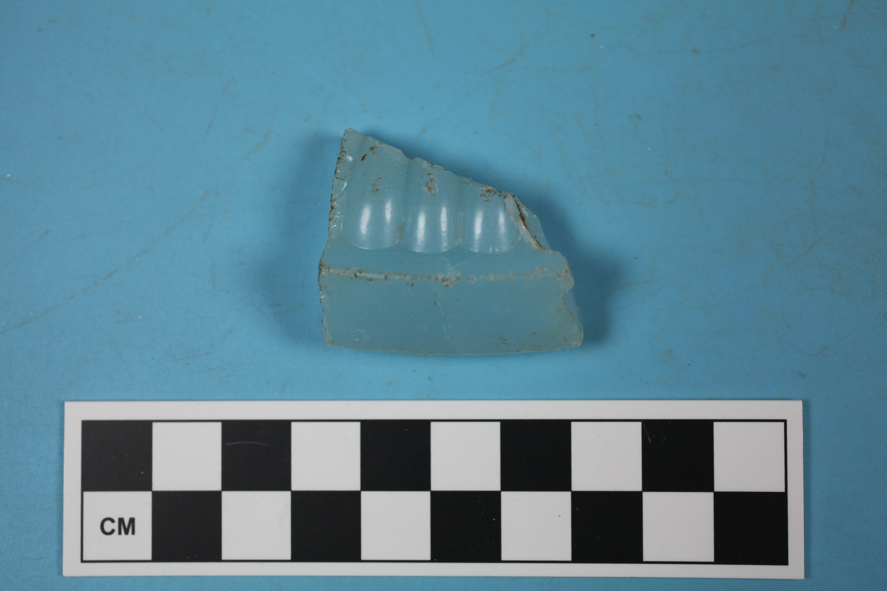 One fragment of light blue rim. Probably from a light shade or similar vessel. Thick moulded rim with raised ridges on external body.