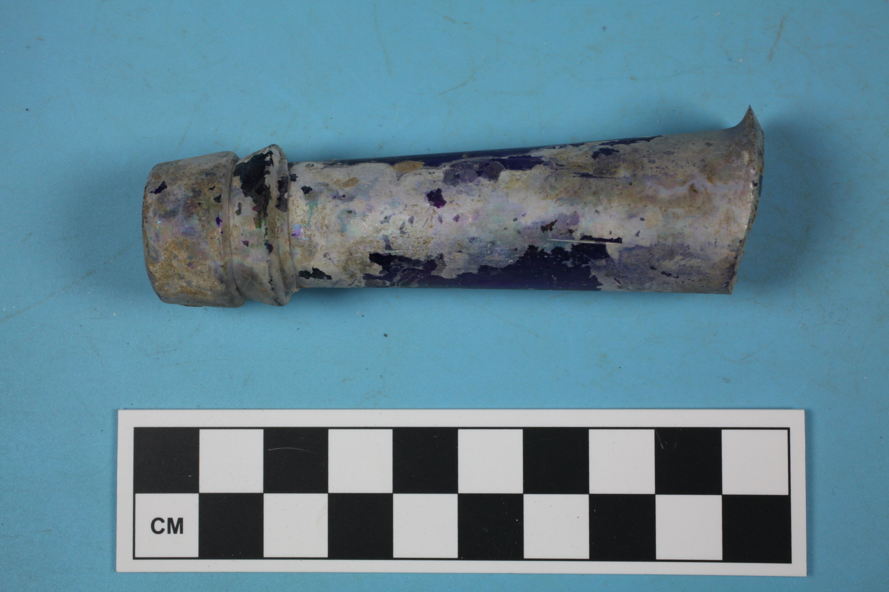 One complete finish/neck of a cobalt blue pharmaceutical bottle. Codd liver oil or similar. Applied tooled two-part v-shaped finish, tapered neck.