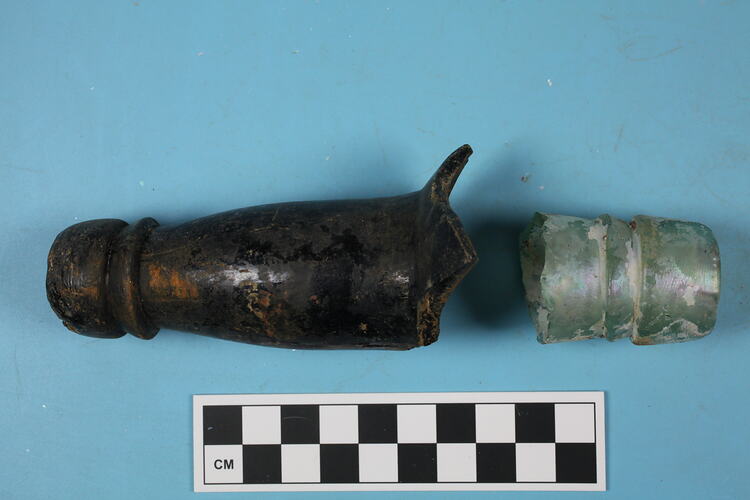 Two bottle finishes. One Olive green beer/wine bottle finish and neck - two part applied tooled v-shaped finish, buldged neck. One Light green liquor bottle finish - applied tooled two part v-shaped finish.