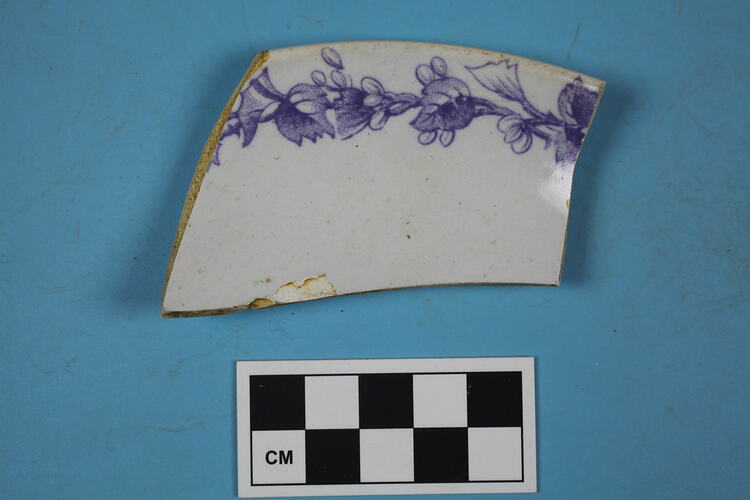 One fragment of whiteare saucer. Blue transfer printed floral border around rim.