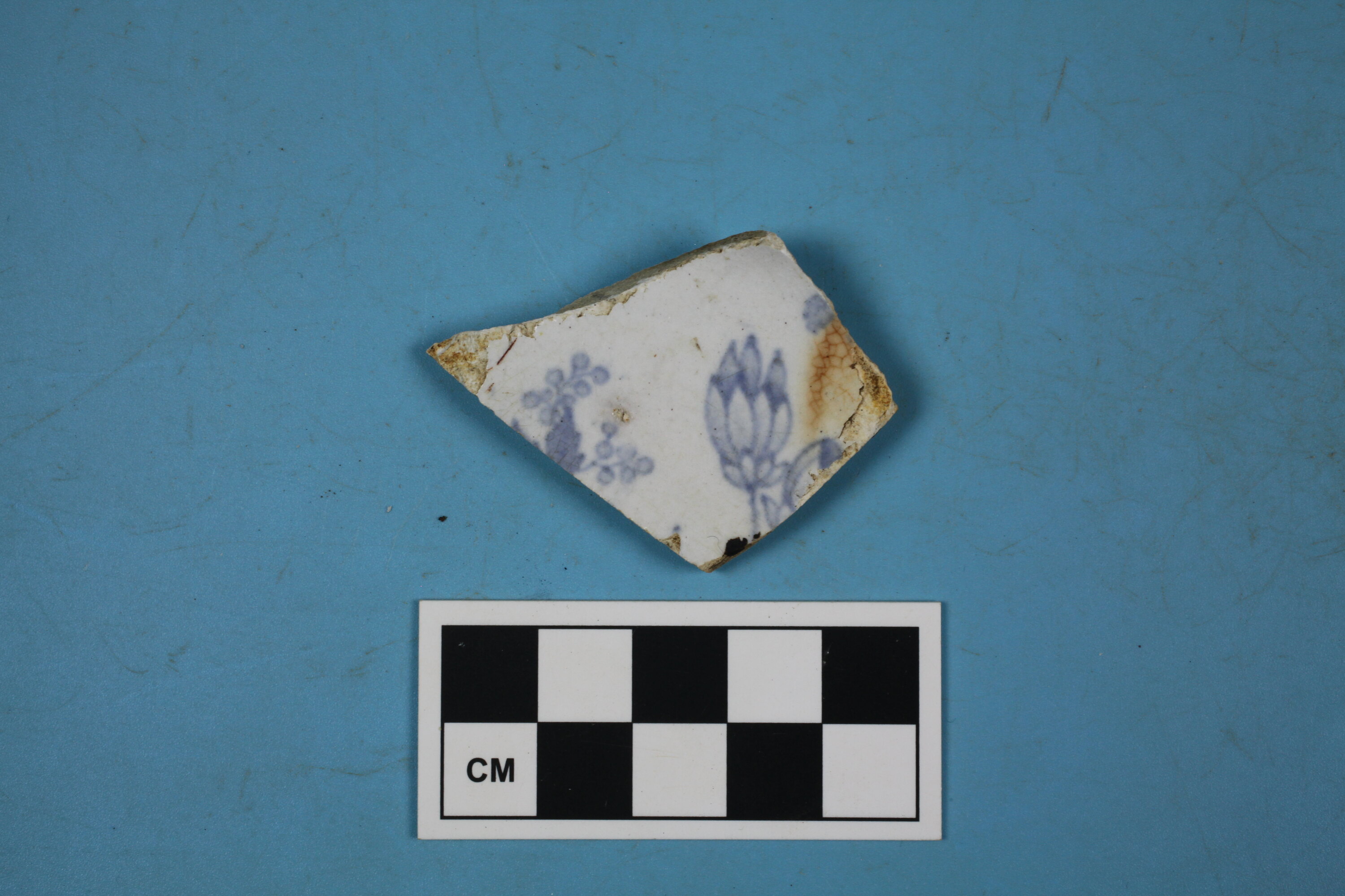 One fragment of whiteware plate base. Blue transfer printed Asiatic Pheasant design.