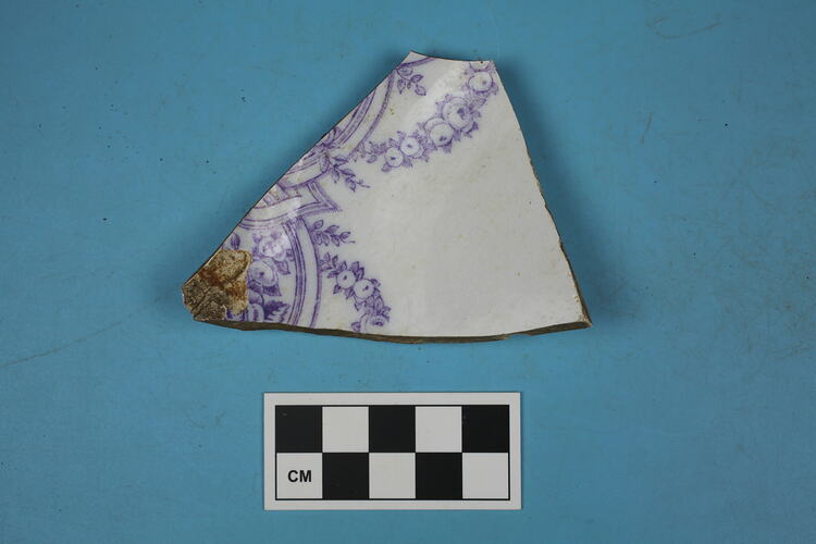 One fragment of whiteware bowl. Purple transfer printed design on concave surface - linked chain cartouches with floral sprays and garlands below. Purple transfer print makers mark on base: "MS." Foot ring.