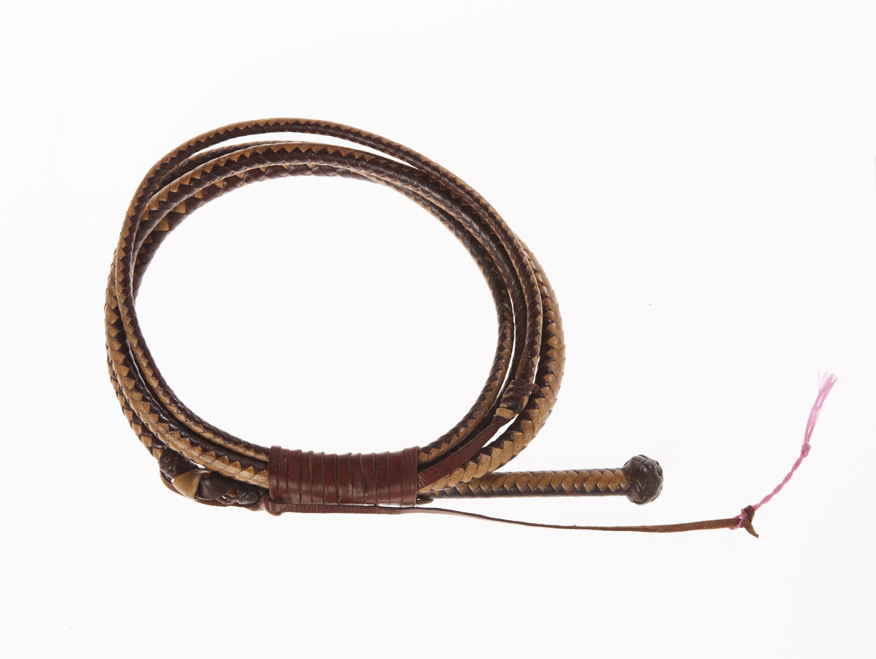 This miniature whip was designed and made by Doug Kite as a hat band. It is made from kangaroo hide, with tan and brown stripe and diamond pattern near handle, which is fully plaited with a Scobie knob. Red cotton is used as the cracker. This is Doug's signature piece, it is unique design and is a significant and beautiful example of his skills as a braider. He has made approximately 200 of these hat bands and has sold them across Australia, and has had a number of orders from the USA.