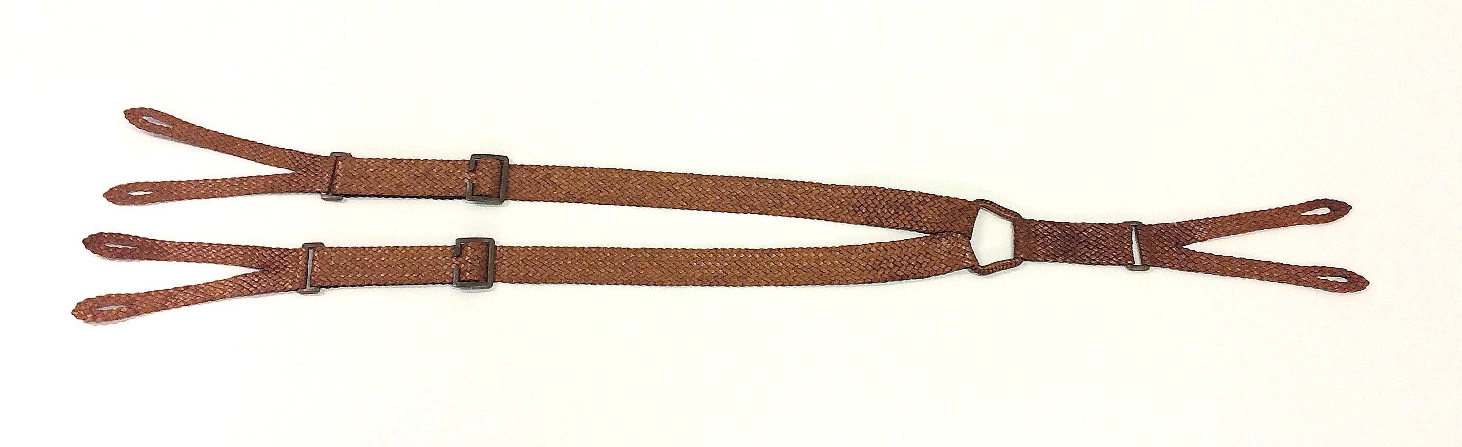 These braces were made by Doug Kite using kangaroo hide with a plain herring bone pattern. It was made for his stall at the Berwick Market. It has never been worn and was altered to fit a girl who indicated an interest in buying them, but she didn't return to collect them.