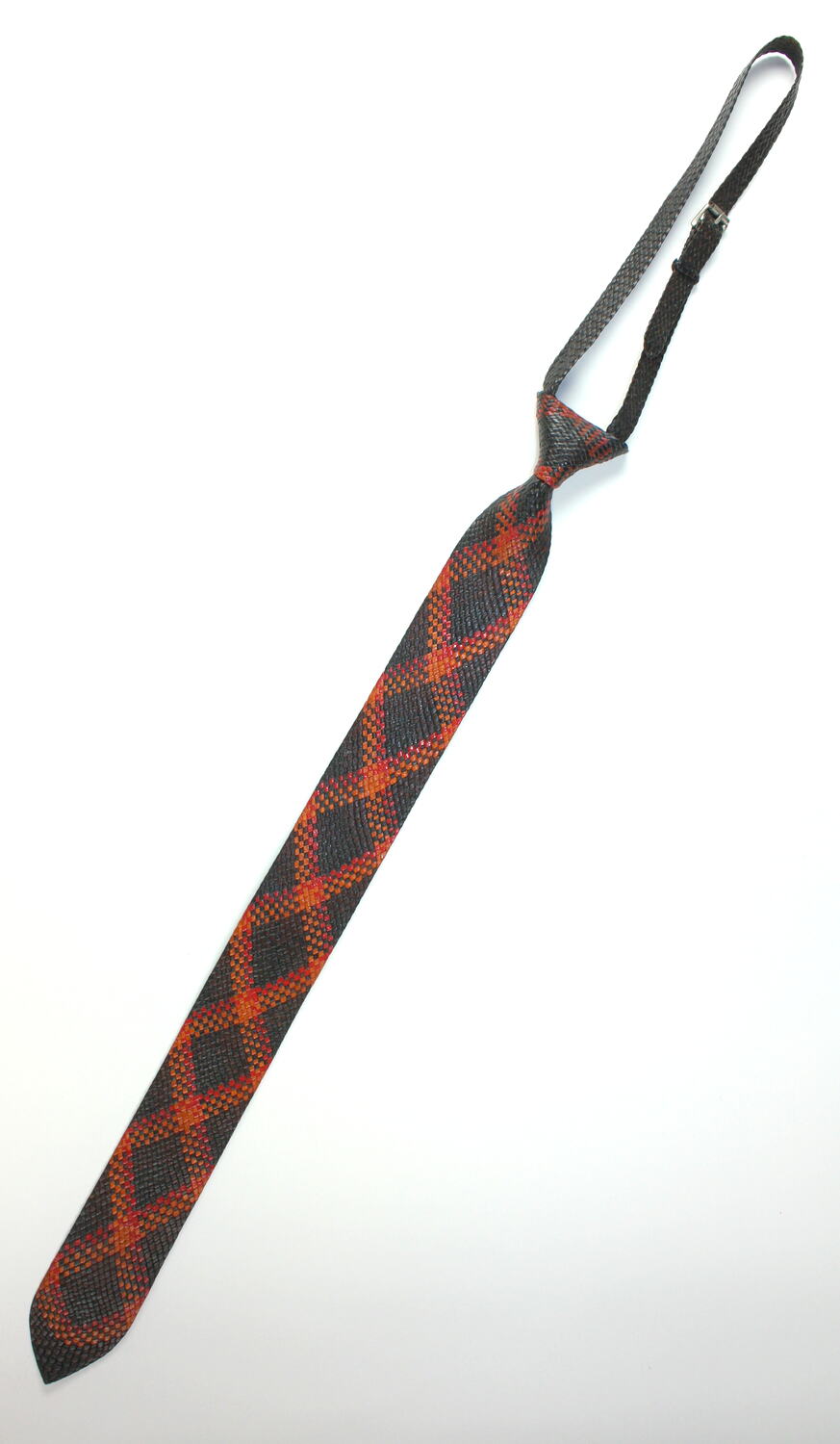This tie was made by Doug Kite, using black, tan and red diamond pattern with a triangular end, using an 'under one-over one' method. The tie is made from kangaroo hide and has a plaited collar strap with adjustable buckle. The edge of the tie has been trimmed. The collection of ties that Doug has made are another example of his innovative, mathematical and creative flair in designing plaited items that have no known precedent.