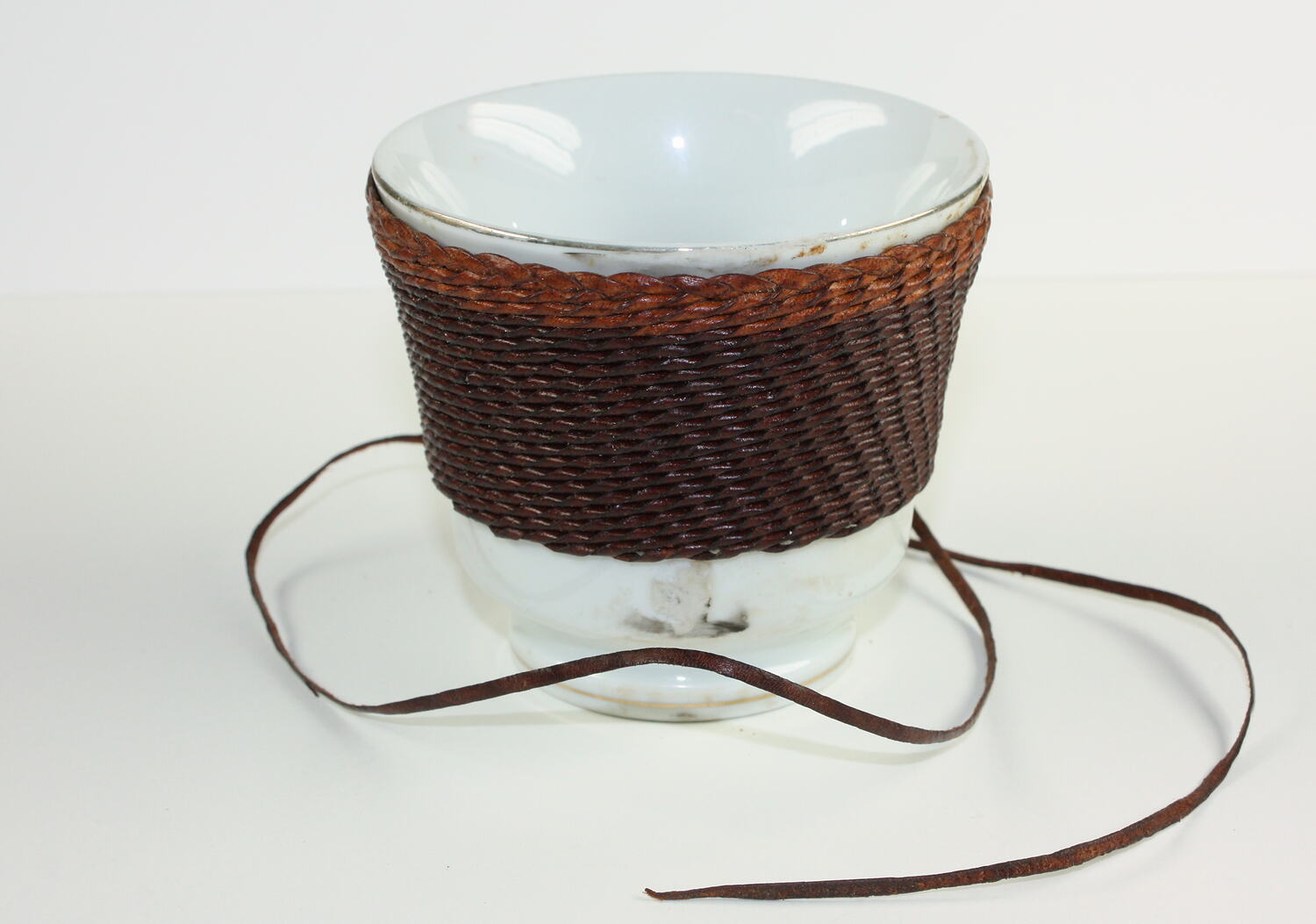 This partly completed tea cup was made by Doug Kite using kangaroo hide with 'brandy' leather and a 'natural' edge. It is made using a 3 plait from the top edge then a flat 'fish scale' plait. This item shows the plaiting process and how to use a mold to create plaited items.