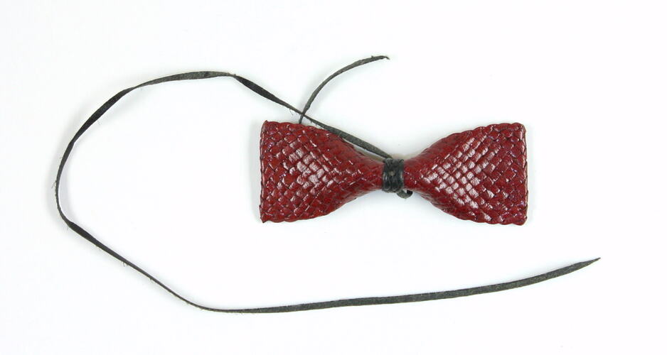 This miniature bow tie was made by Doug Kite, and is an example of what he created when he was 'just playing around' with leather. This item could be used a decorative piece on clothing, shoes, hats.